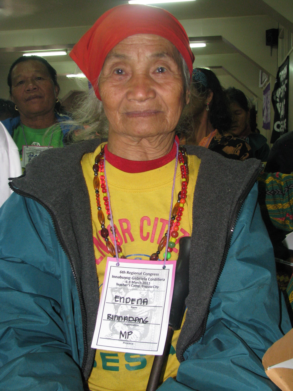 In the early 1990s, human rights conflicts erupted in her community and province with the positioning of the 702nd Brigade which had the infamous Jovito Palparan as one of the commanding officers. Endena emerged to become one of the leaders of the Cordillera Peoples Alliance. She advocated for peace and courageously defended the human rights of indigenous peoples despite the harassments and threats she received from the military.