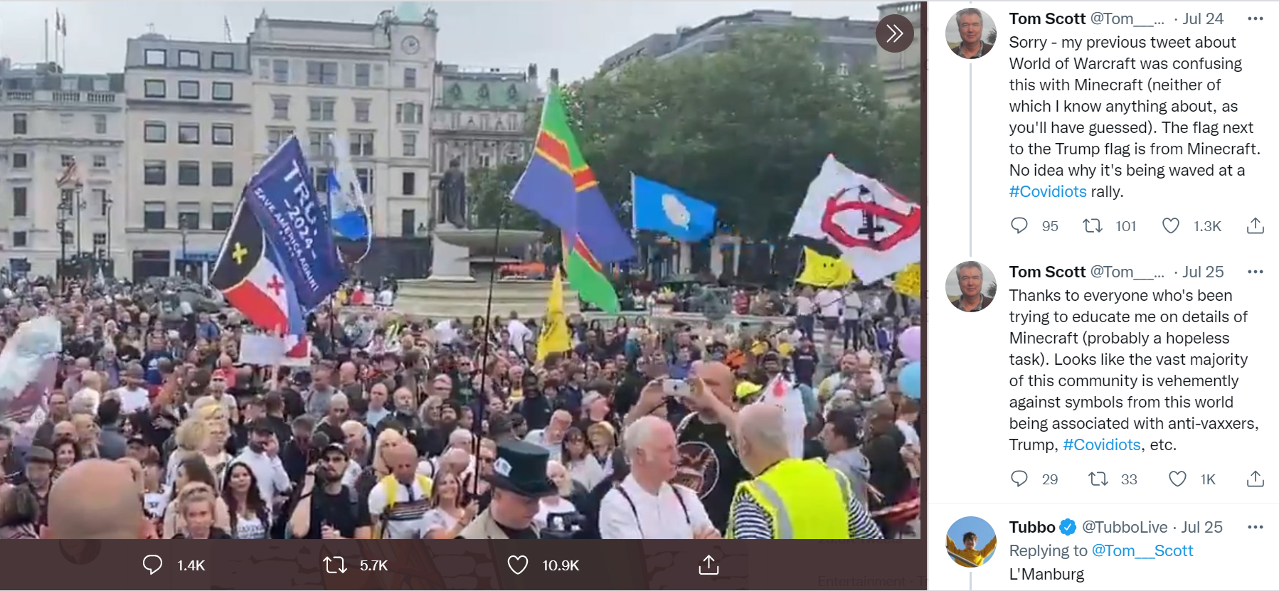 The boundaries between the online world and real life are blurring. In an anti-vax rally in London, gamers quickly spotted a “L’Manberg” flag among the protesters. What was funny was that L’Manberg is a fictional nation that is part of the plotline in the Dream SMP. Due to the large audience that the roleplay SMP has, anyone googling “freedom flag” will come up with the L’Manberg flag. L’Manberg waged a revolution—although unsuccessful—against the tyranny of an evil oppressor (the evil oppressor in question is a green and white smiley blob).