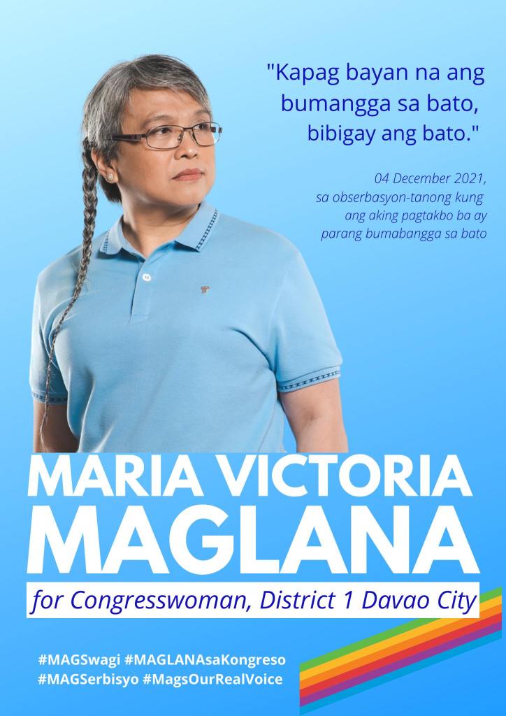 Maria Victoria Maglana, or Mags, is determined to offer an authentic “alternative to the Duterte dynastic playbook.” Maglana is running for a congressional seat in District 1 of Davao challenging incumbent, Paolo Duterte, the son of President Rodrigo Duterte, in the Dutertes’ own bailiwick.