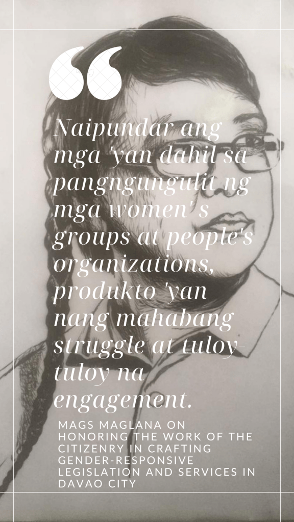 During the discussion, Maglana looped back to where we began the conversation more than two weeks ago. Mags ventured to confront the same paradox-irony that weighed heavily on her mind and on the minds of many feminists for sometime now-—that while Davao is one of the most gender-response local government units (LGU), its former leader who is now in Malacañang is according to her, “the biggest, loudest, and most abusive voice against women.” This time she has found a resolution to the contradiction.