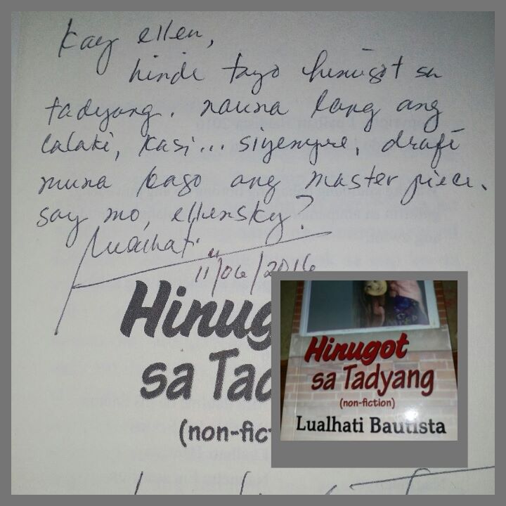 Pinasadahan ni Lualhati ang mga obra sa computer at parang sinilihan. Nang sabihin kong ang theatre actor na si Malou de Guzman ang napipintong collaborator, hindi nagpatumpik-tumpik ang supernova. Nilatag agad ang kanyang mga kondisyon: “Magkulong tayo sa isang hotel. Magkwento ka tungkol sa Violence Against Women na nasasagap mo sa inyong NGO at mabubuo natin yan!”